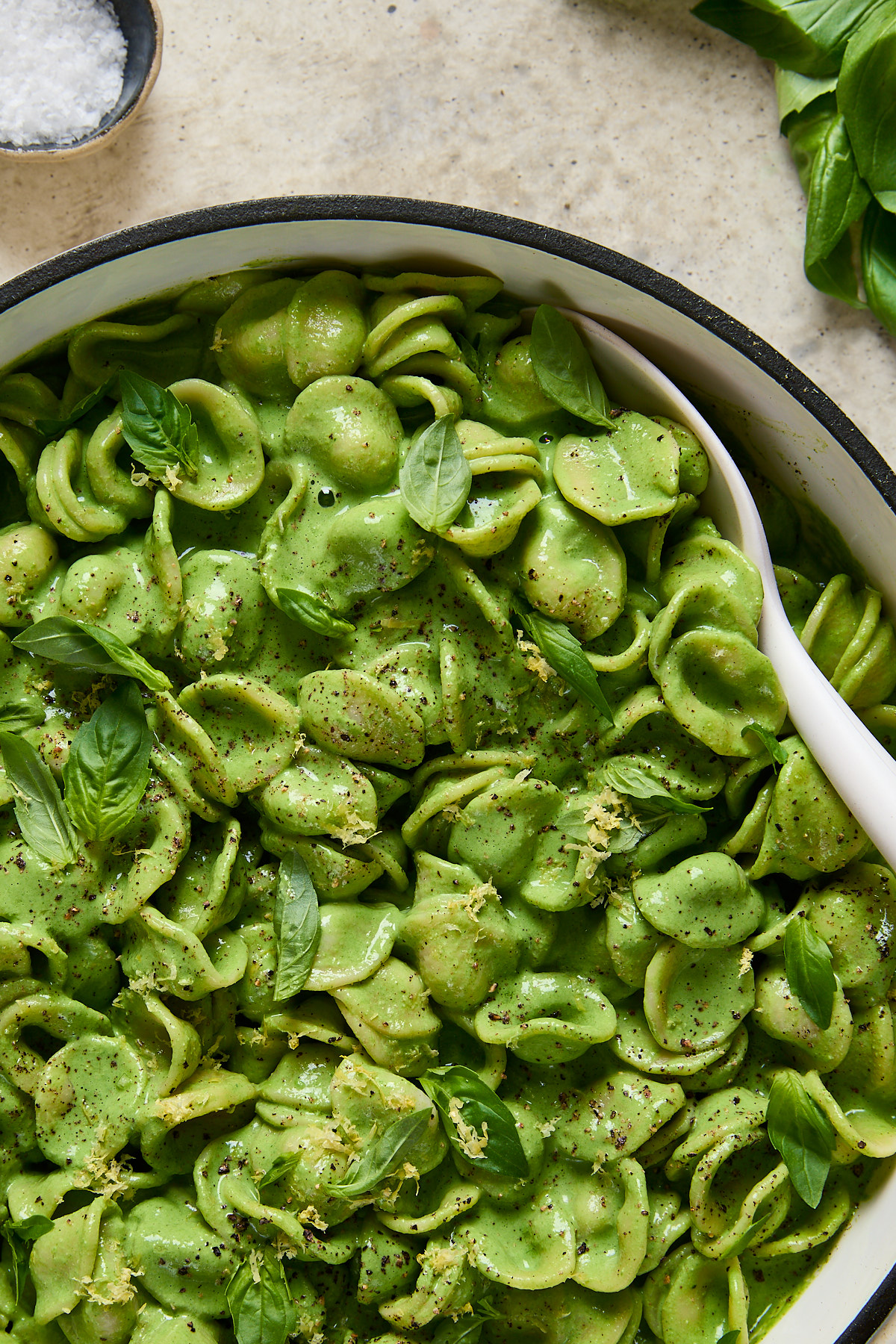This sauce is fresh and creamy, so I recommend short pasta shapes like rigatoni, penne, or fusilli. They grab onto the sauce perfectly. But really, whatever's in the cupboard will do the trick-this is meant to be low effort, high reward.